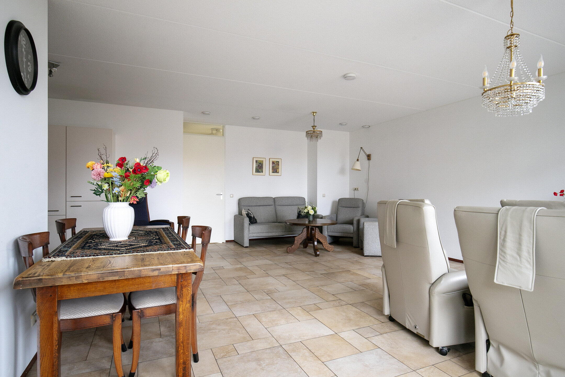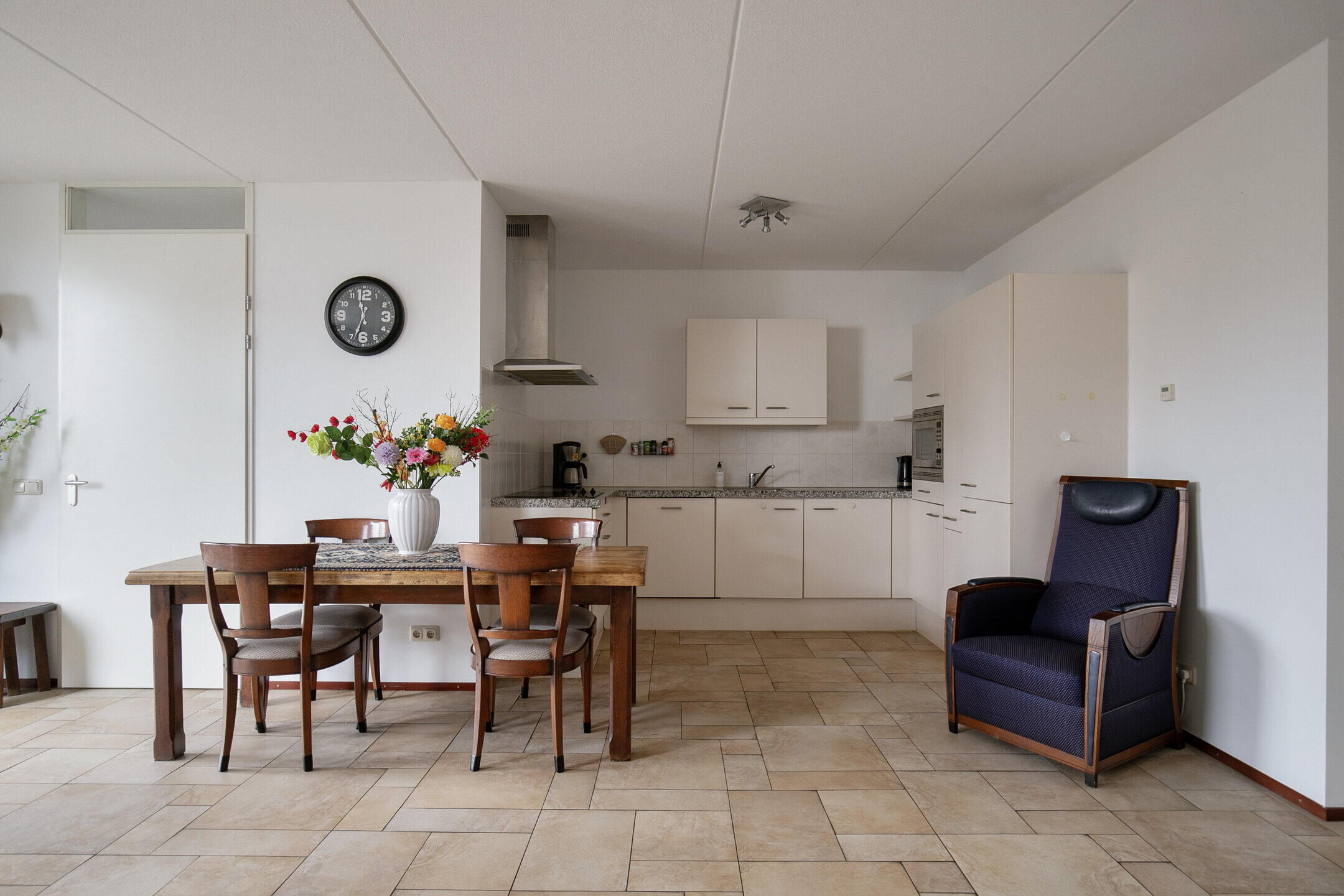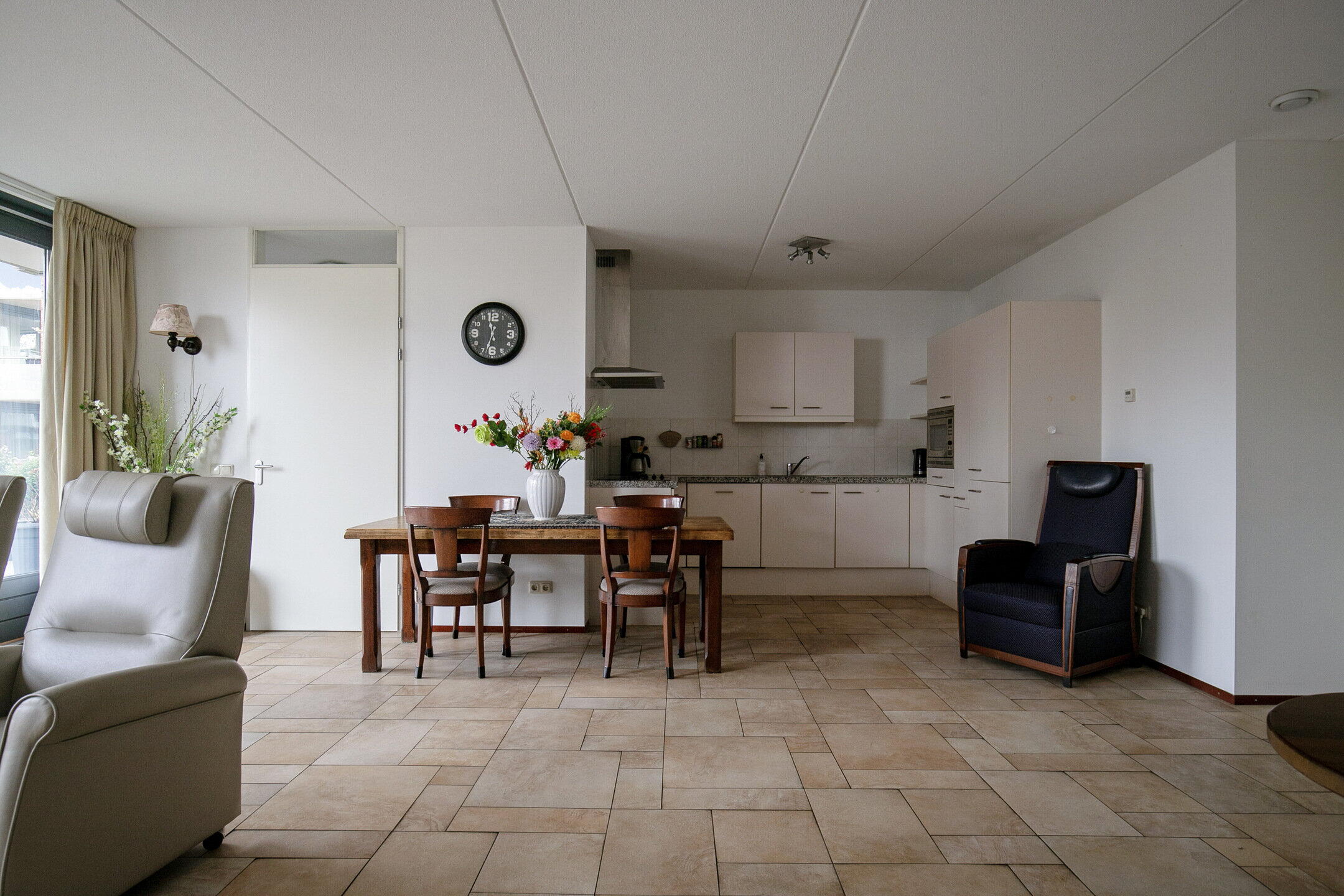 De zeer royale en lichte woonkamer is voorzien van comfortabele vloerverwarming en heeft via een schuifpui een vrij en groen uitzicht aan de voorzijde. De fraai verzorgde tuinen aan deze zijde versterken het rustige en aangename woongevoel. De open keuken (vernieuwd in 2015) is uitgevoerd in een praktische U-opstelling en voorzien van diverse inbouwapparatuur, waaronder een inductiekookplaat, vaatwasser, koel-vriescombinatie en combimagnetron. Een fijne plek om te koken en tegelijk in verbinding te blijven met de woonkamer en eventuele gasten.