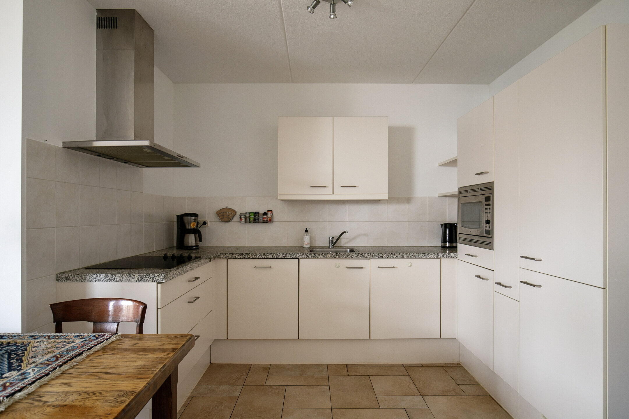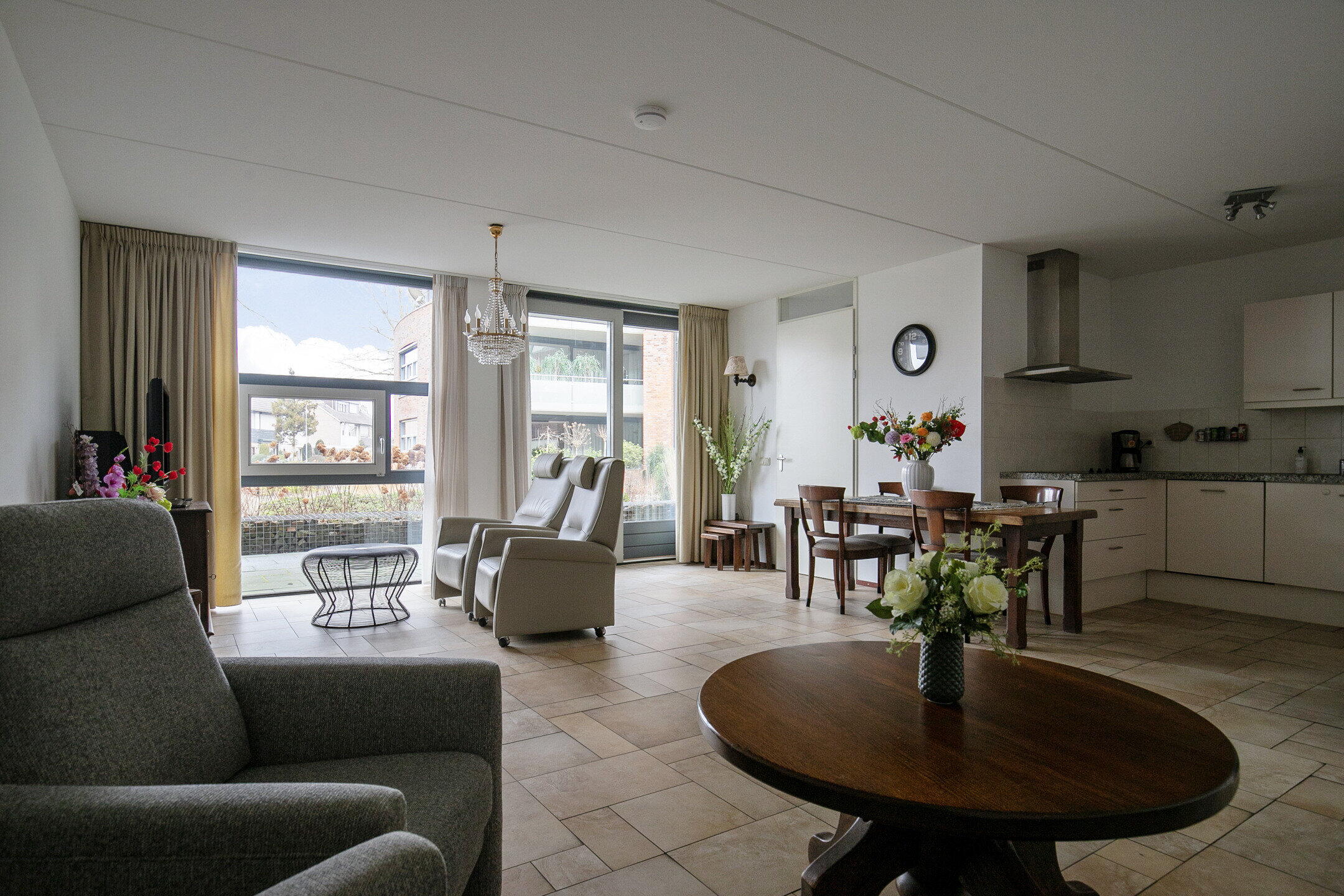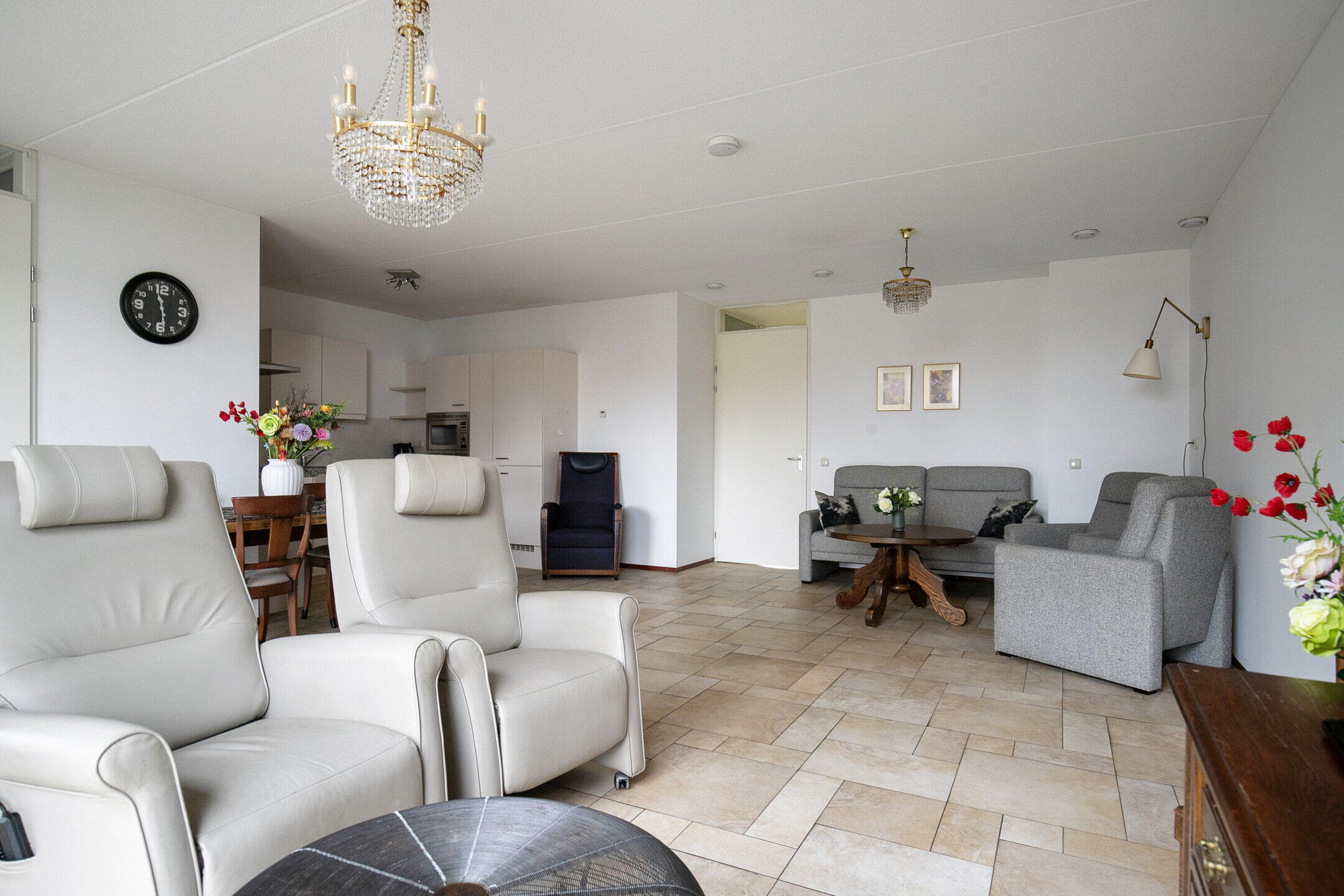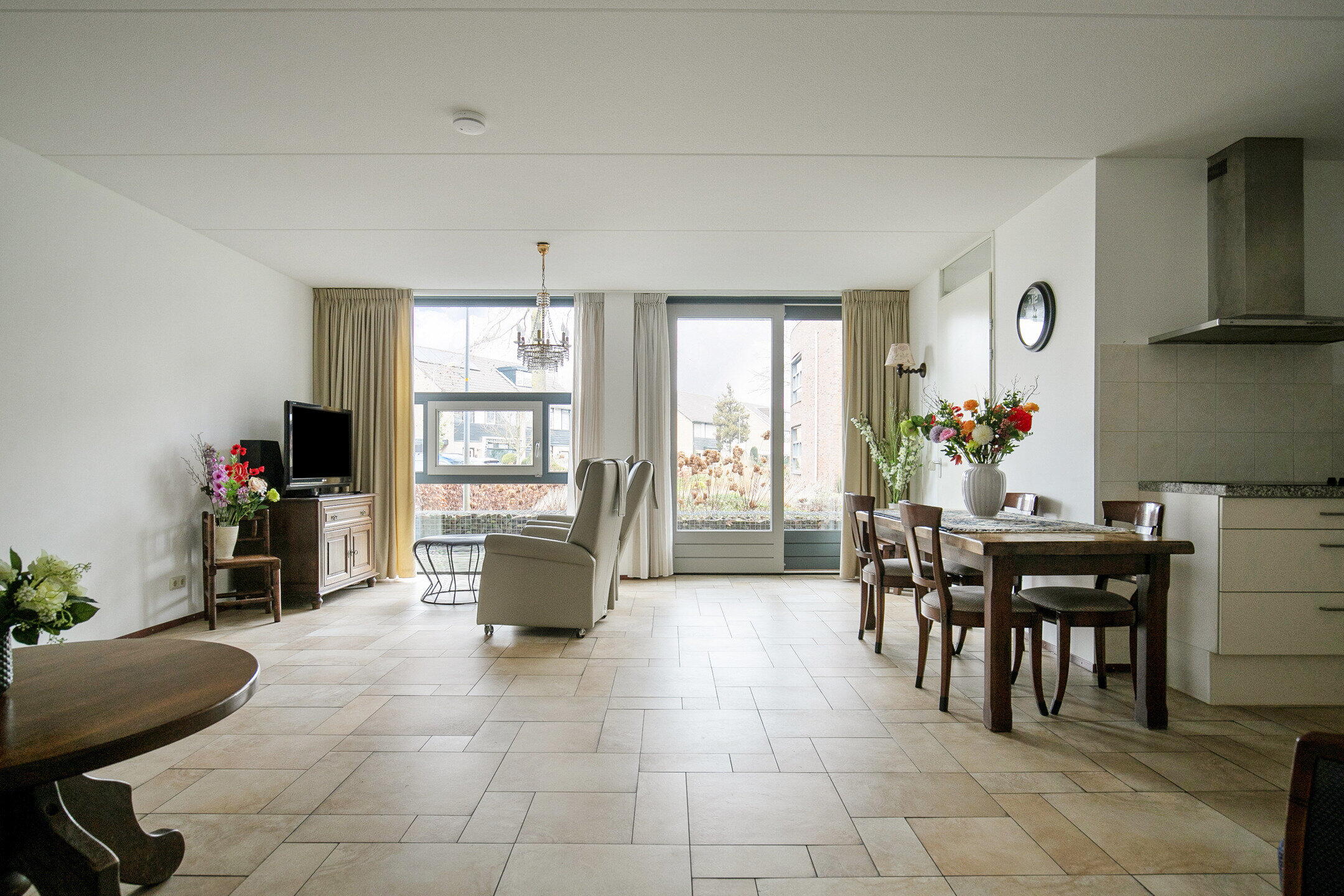 De zeer royale en lichte woonkamer is voorzien van comfortabele vloerverwarming en heeft via een schuifpui een vrij en groen uitzicht aan de voorzijde. De fraai verzorgde tuinen aan deze zijde versterken het rustige en aangename woongevoel. De open keuken (vernieuwd in 2015) is uitgevoerd in een praktische U-opstelling en voorzien van diverse inbouwapparatuur, waaronder een inductiekookplaat, vaatwasser, koel-vriescombinatie en combimagnetron. Een fijne plek om te koken en tegelijk in verbinding te blijven met de woonkamer en eventuele gasten.