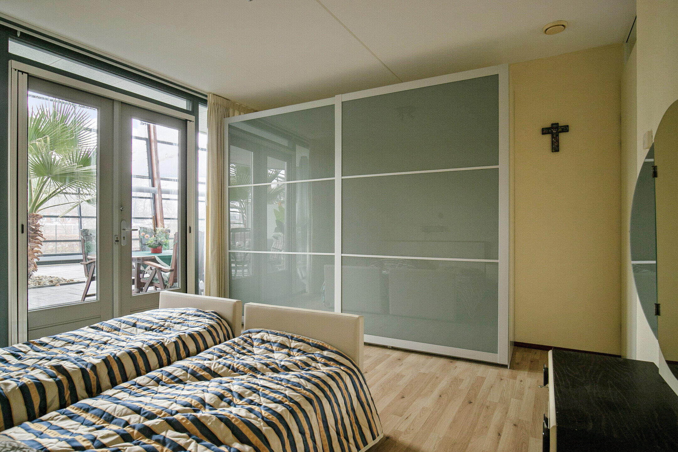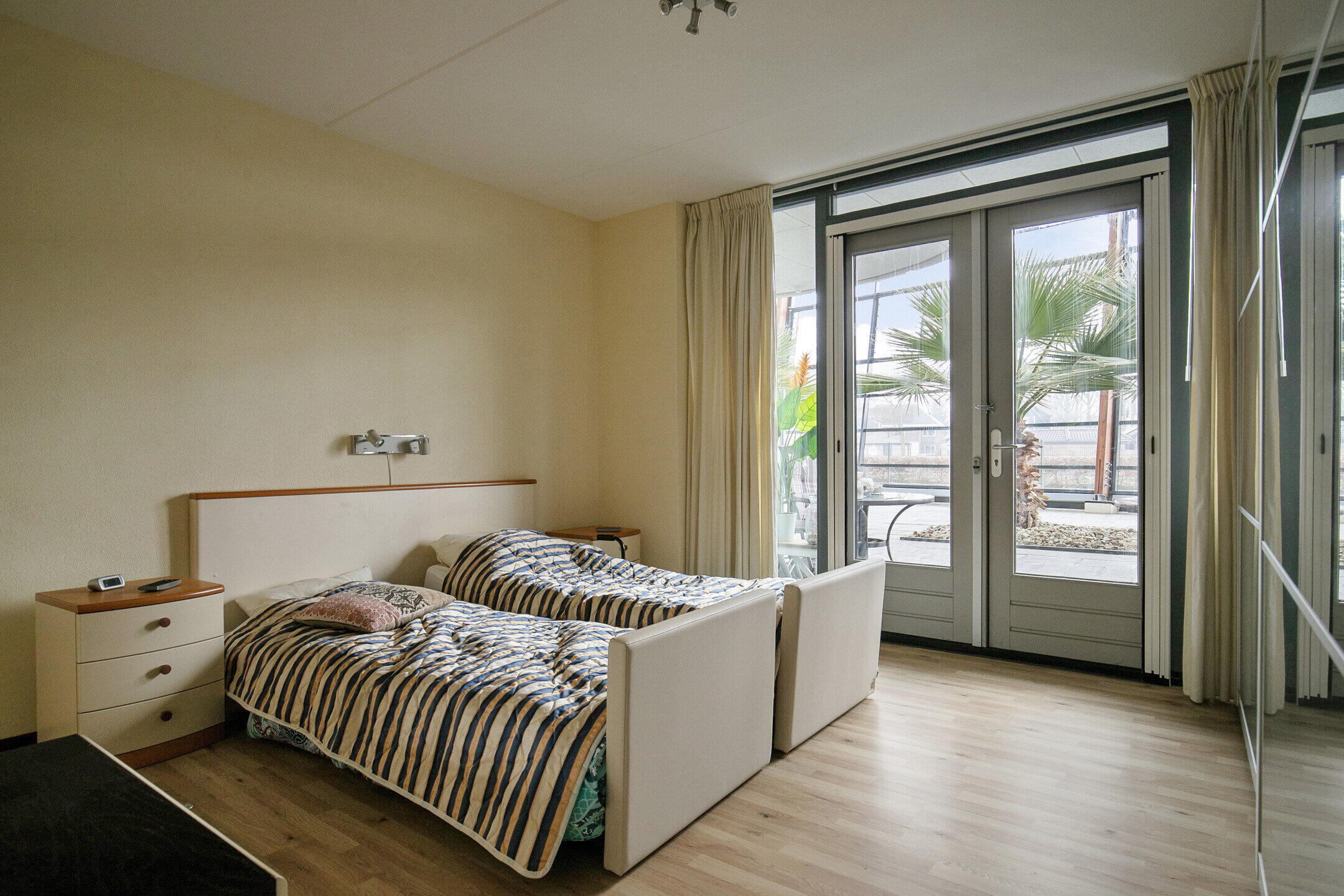 Vanuit de gang zijn de twee slaapkamers bereikbaar. De master bedroom beschikt over dubbele openslaande deuren en biedt ruim voldoende plaats voor een groot tweepersoonsbed en een royale kledingkast. De tweede slaapkamer is uitstekend geschikt als logeer-, werk- of hobbykamer – een prettige luxe.