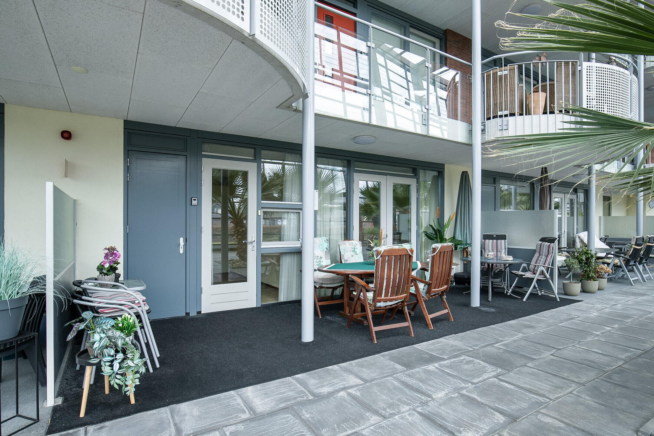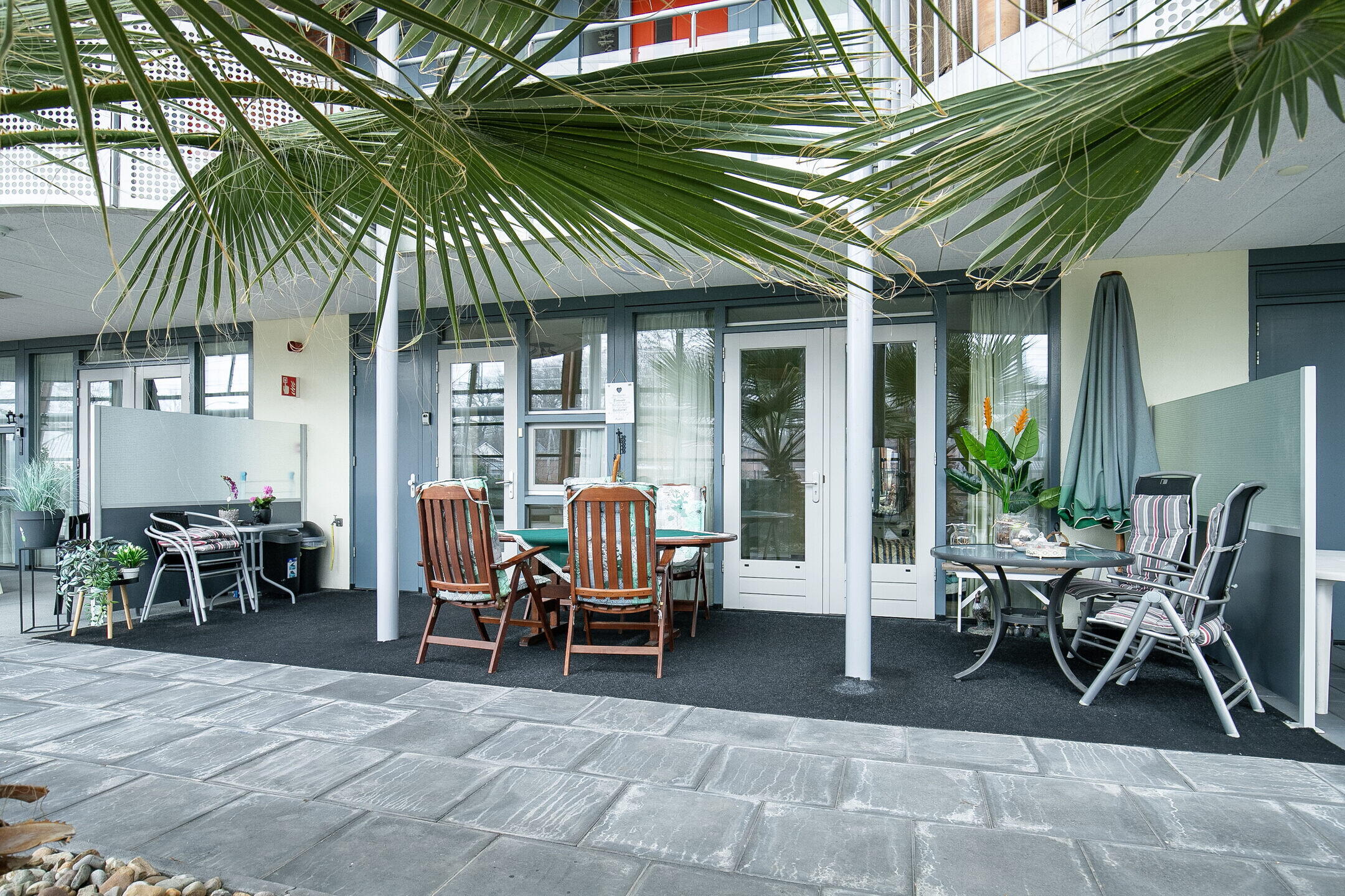 Het overdekte privé terras in de binnentuin is een heerlijke plek om beschut buiten te zitten. De binnentuin is fraai aangelegd en nodigt uit tot een praatje met buurtgenoten, terwijl er tegelijkertijd voldoende ruimte is om in alle rust privé te genieten. Deze combinatie van sociale binding en privacy behoort tot de grote kwaliteiten van dit complex.